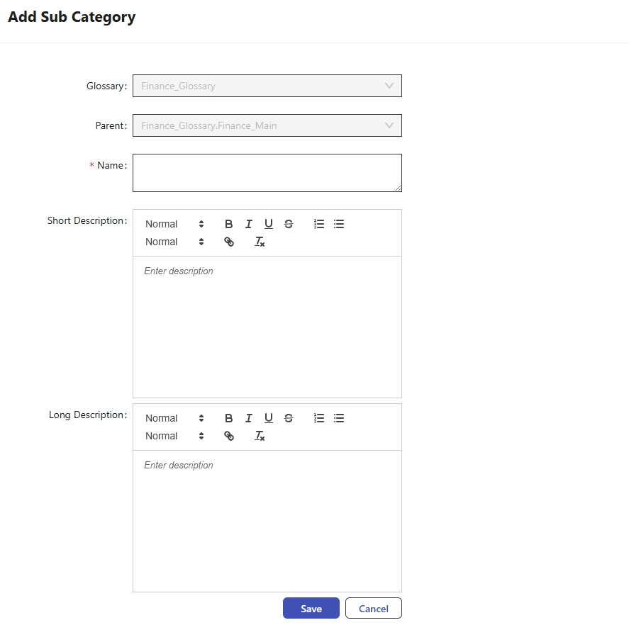 To add a Sub Category, select the relevant category from the left panel and click the + button. In the opened page, select the relevant glossary and parent, enter the Name and Descriptions, then click the Save button.