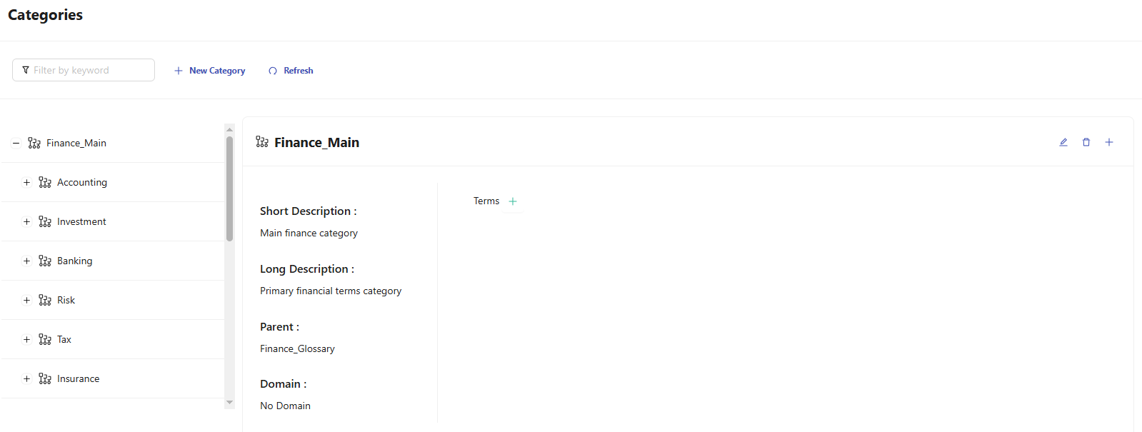 Categories menu is used to view categories as a hierarchical list with Name, Short Description, Long Description, Parent, Domain and Terms. It allows the creation of new categories and the editing, deleting, and filtering of existing ones.