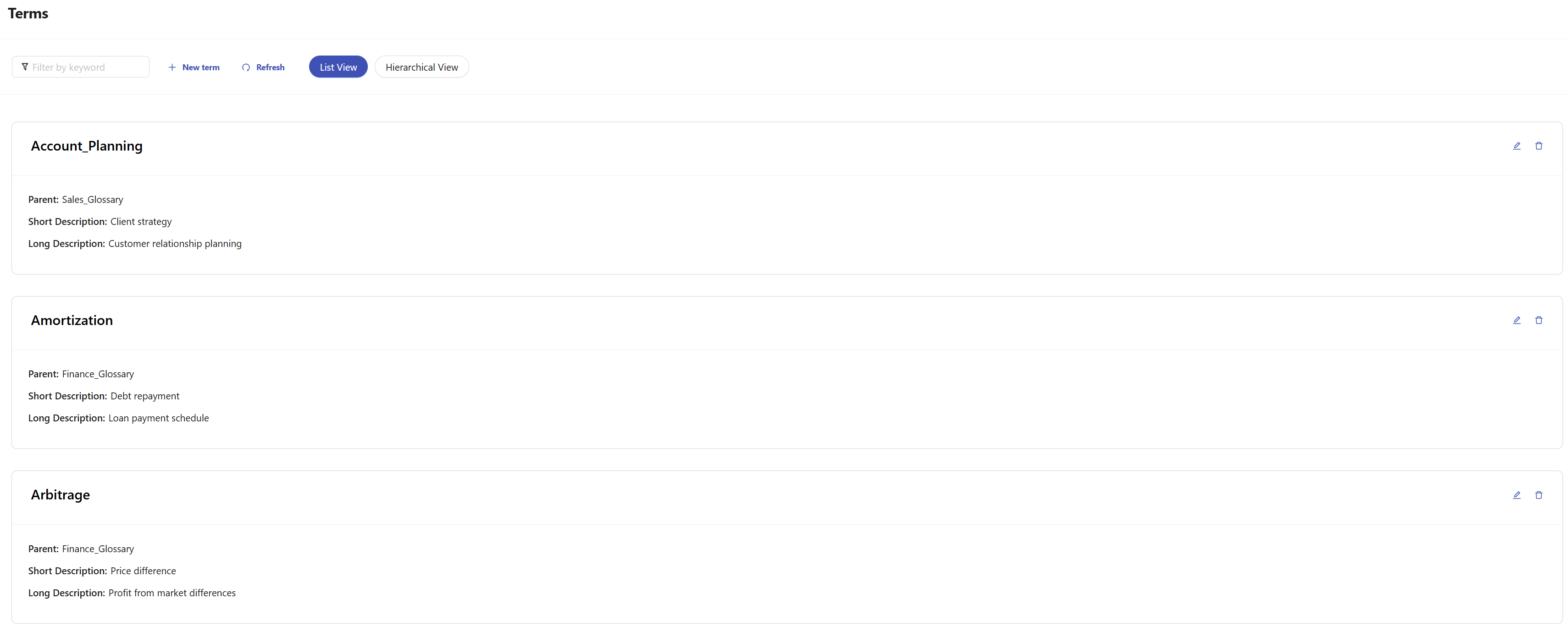 To edit a glossary, click on Edit button that appears when you hover over the relevant glossary. After editing the related fields, click Save to save the changes.