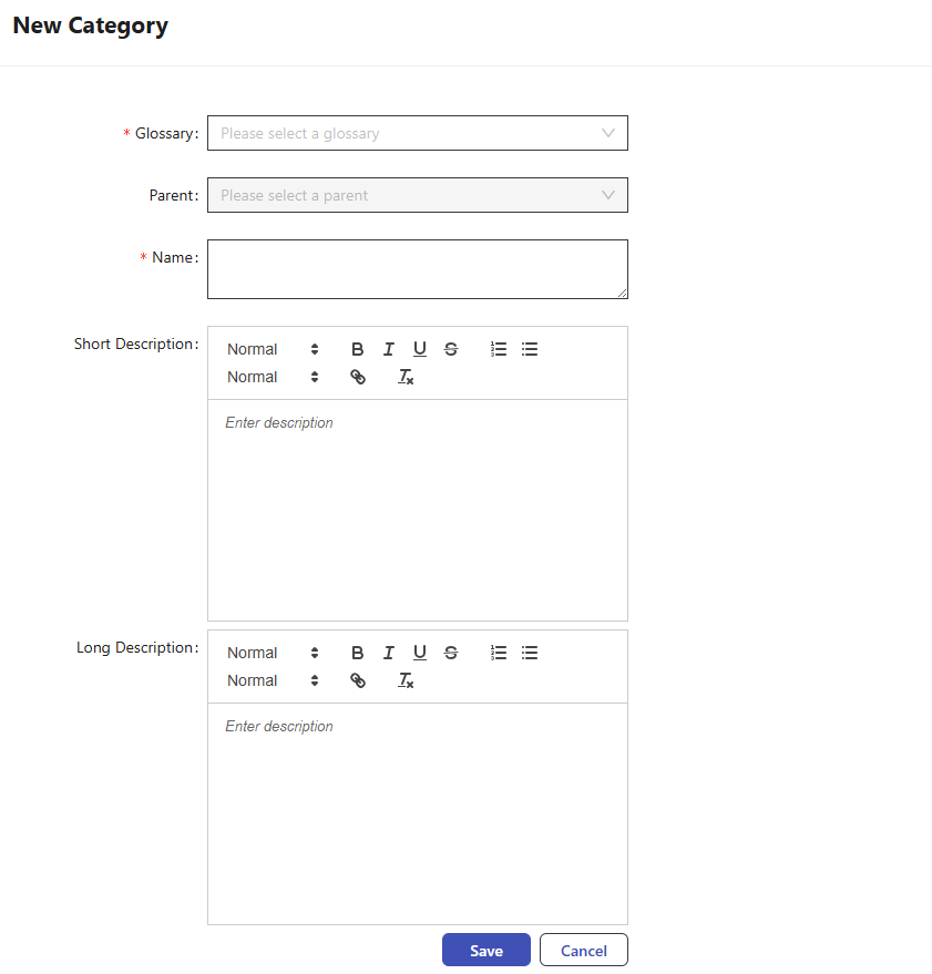 To create a new Category, click + New Category button from the top of the window. Enter the Glossary, Parent, Name, Short Description, and Long Description fields, then click Save.