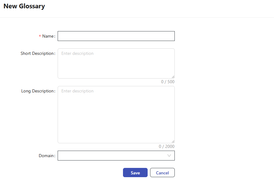 To create a new Glossary, click + New Glossary button from the top of the window. Enter Name, Short Description,Long Description, and Domain fields, then click Save.