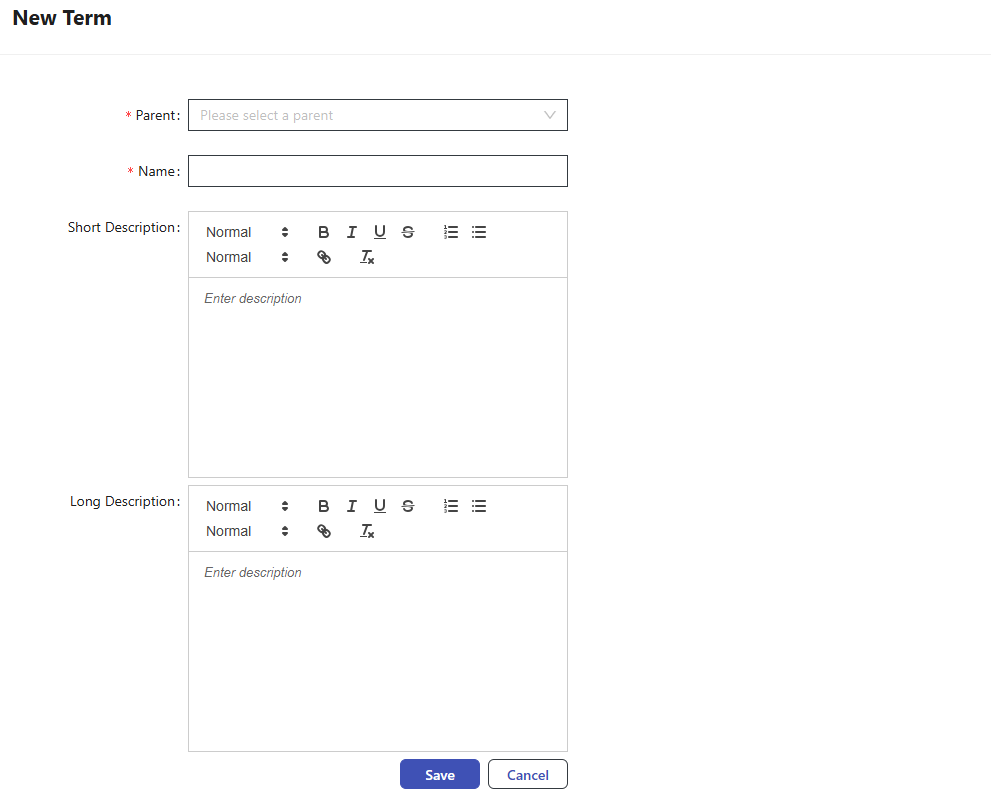 To create a new Term, click + New Term button from the top of the window. Enter Parent, Name, Short Description, and Long Description fields, then click Save.