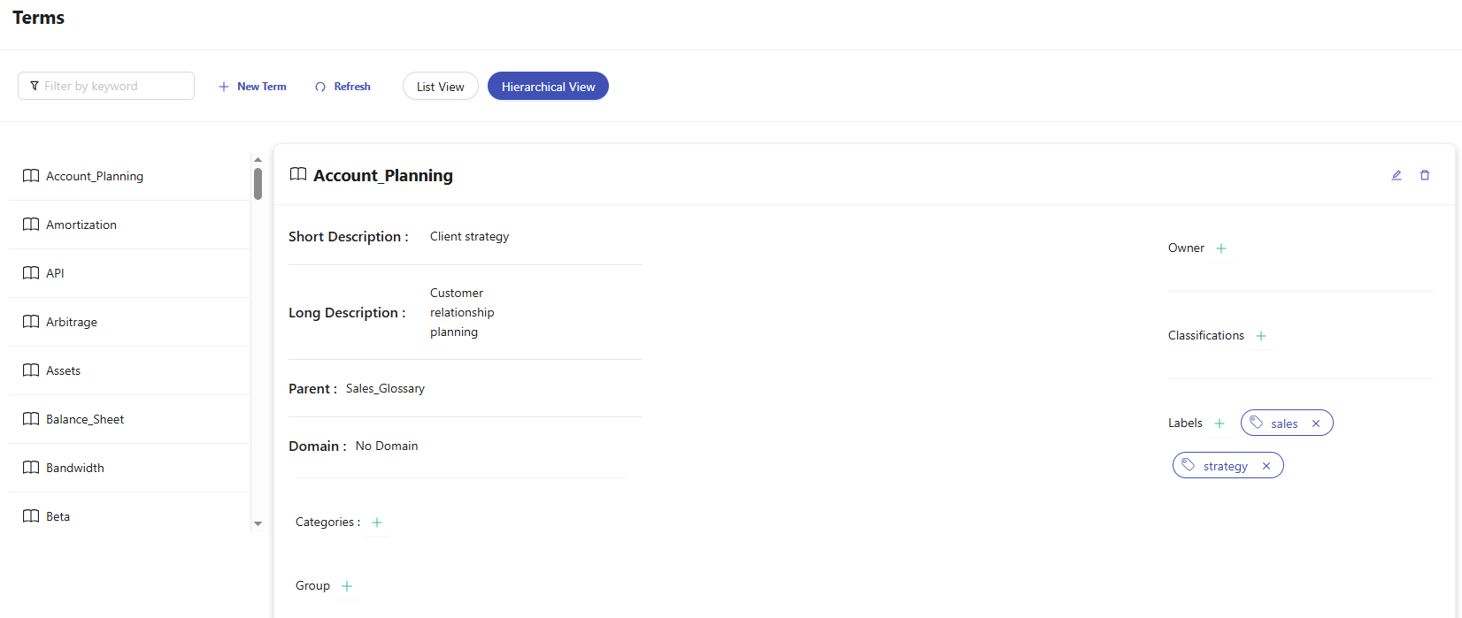 Terms menu is used to view terms as a list with Name, Short Description, Long Description, Parent, Domain, Categories, Group, Owner, Classifications, and Labels. It allows the creation new terms and the editing/filtering existing ones.