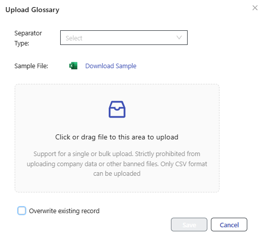 To upload a glossary, click the Upload Glossary button. Select the separator type, upload the glossary file, and then click Save.