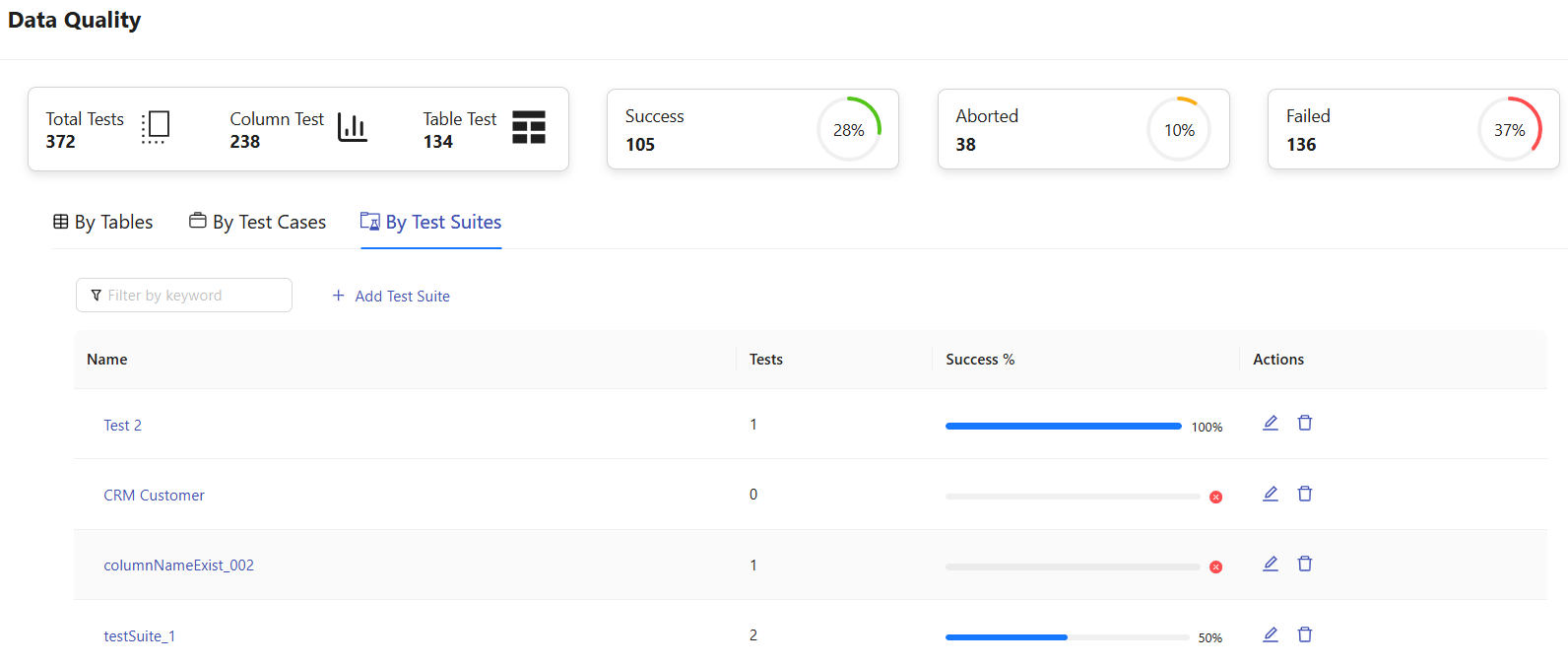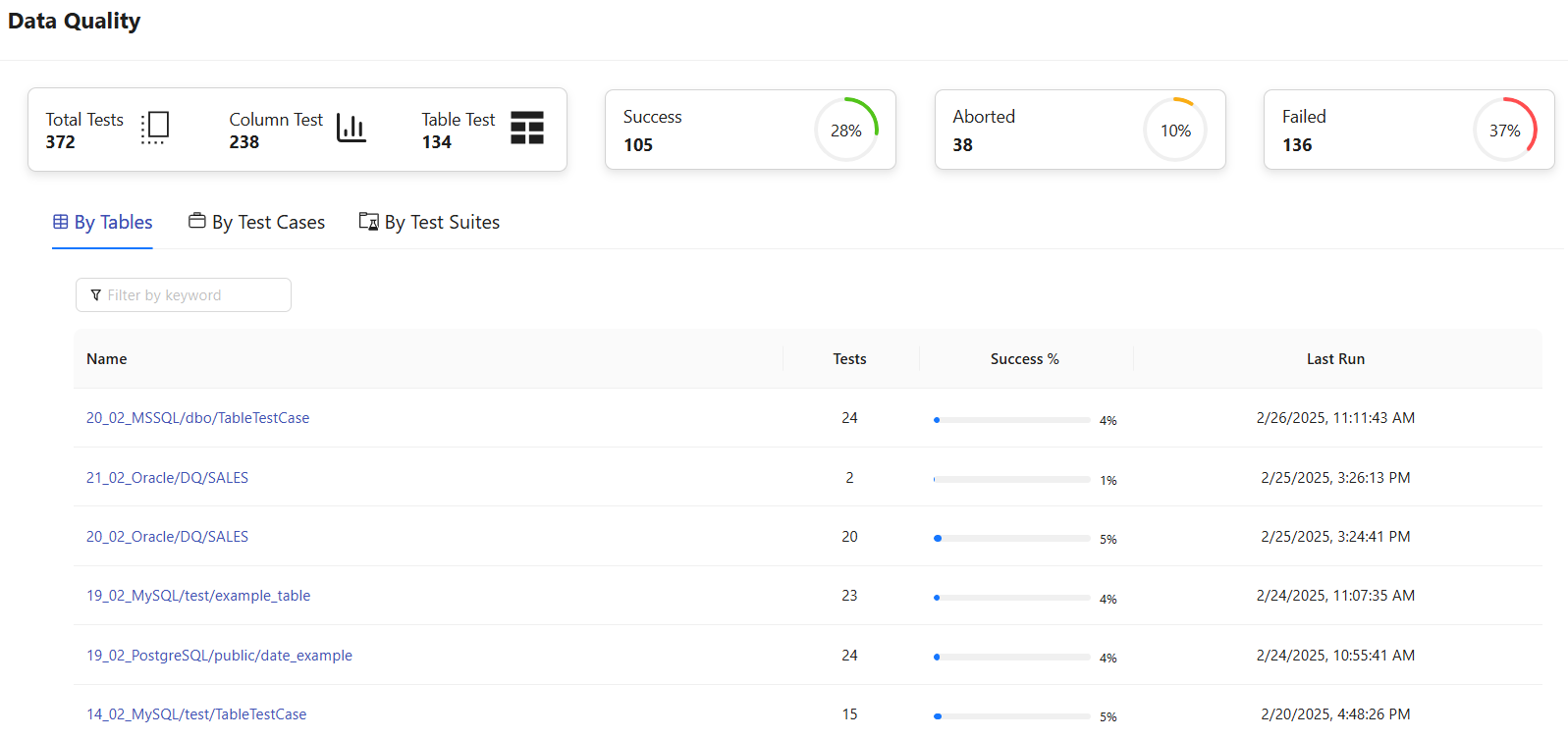 Data Quality displays the total number of tests performed, along with the counts of Success, Aborted, and Failed tests. You can access related tests and their details through the By Tables, By Test Cases, and By Test Suites tabs. For details on data quality profiling metrics and available test cases, go to Data Quality.