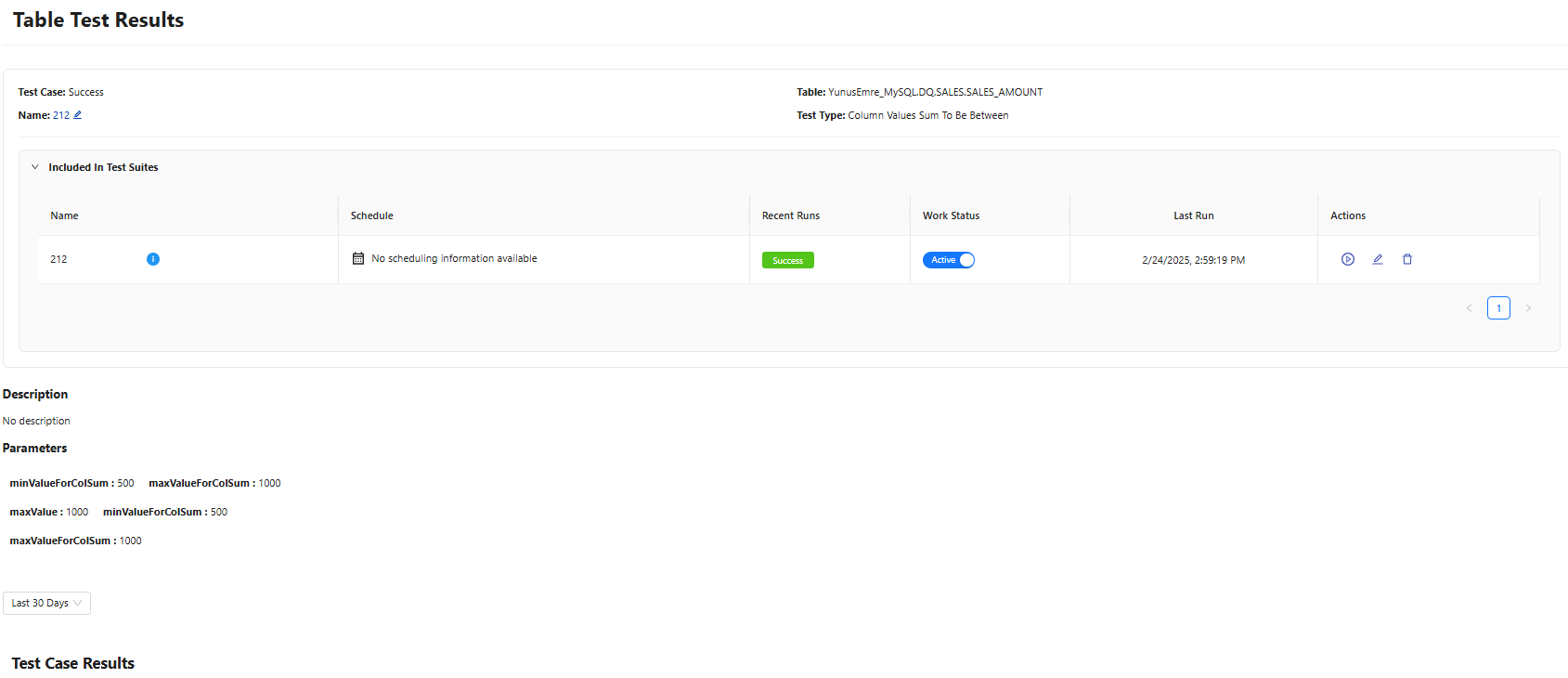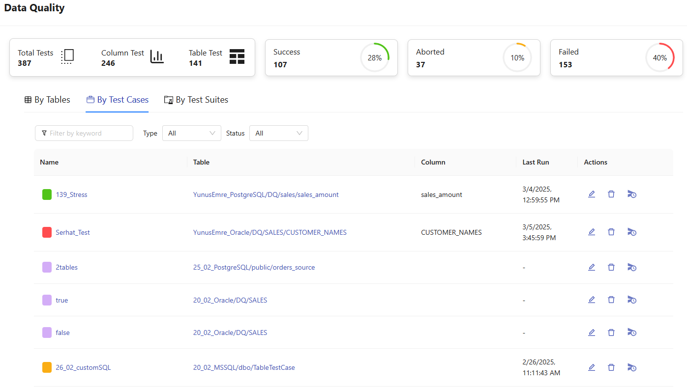 It displays test cases along with the related table, column, and last run date details. Editing, navigating to the run page, and deletion operations are performed from the Actions section.