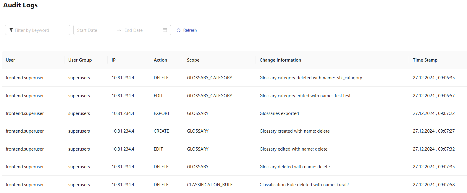 The Audit Logs page lists logs with details such as User, User Group, IP, Action, Scope, Change Information, and Timestamp. Filtering by date and keyword is available.