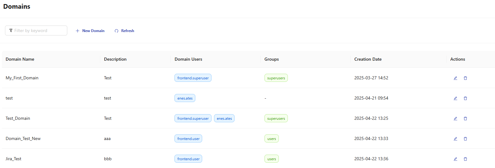 The Domains page is used to list existing domains and add new ones. Domains are displayed in a table format with the following details: Name, Description, Domain Users, Groups, and Creation Date. Edit and delete actions can be performed using the corresponding buttons in the Actions column of the table.