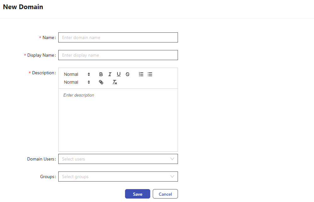 To add a new domain, click the + New Domain button. On the domain creation page, you must provide the following information: Domain Name, Display Name, Description, Domain Users, and Groups. Once all fields are filled in, click the Save button to complete the process.