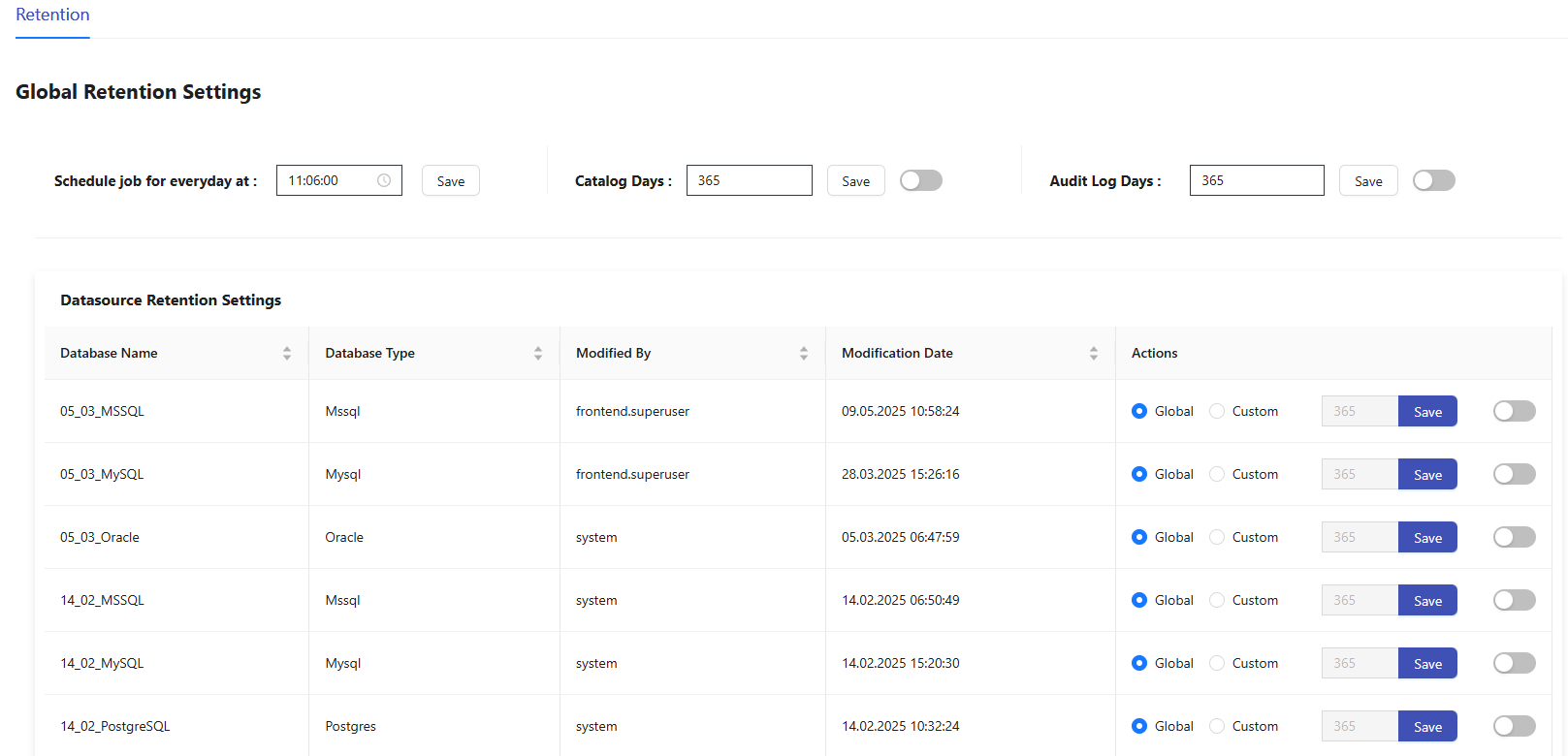 Data Source Retetion Settings list displays retention settings along with details such as Database Name, Database Type, Modified By, and Modification Date. From the Action column in this list, each setting can be configured as either Global or Custom, and its active or passive status can be adjusted accordingly.