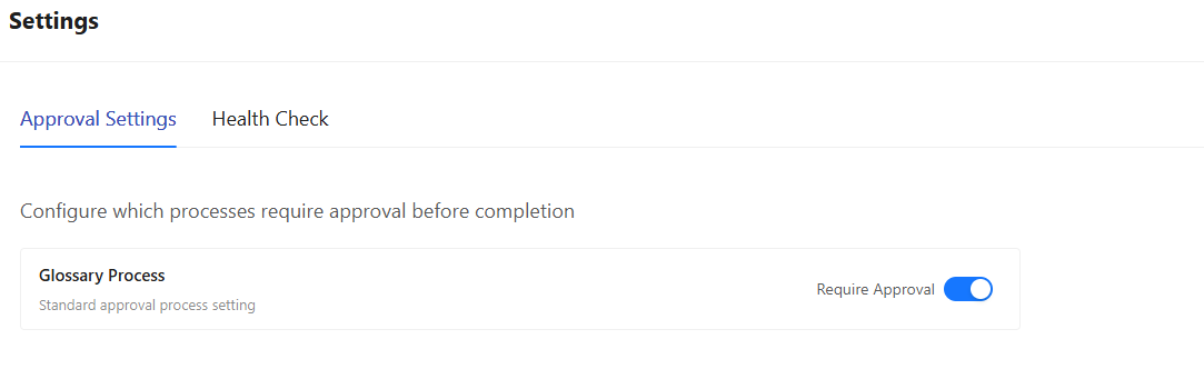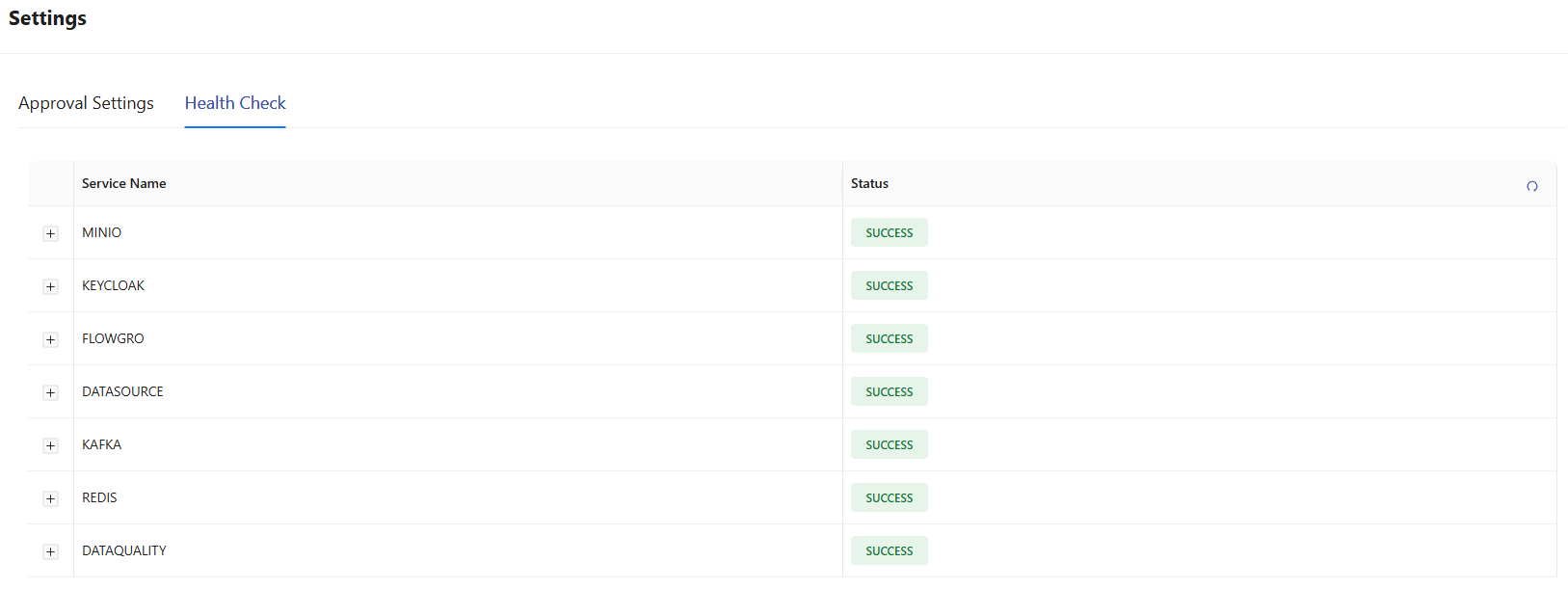 Settings Approval Settings¶ This page displays all approval settings, allowing you to manage their active or passive status directly. Health Check¶ The Health Check page displays the existing services along with their current statuses.