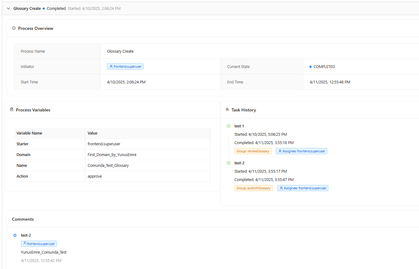 - Process Overview: Shows details such as Process Name, Initiator, Start Time, Current State, and End Time.
