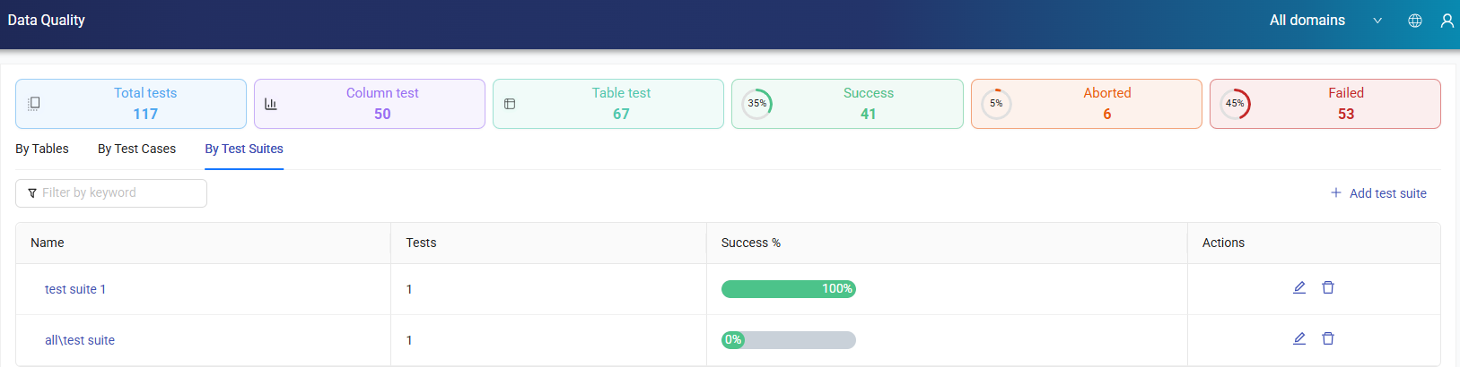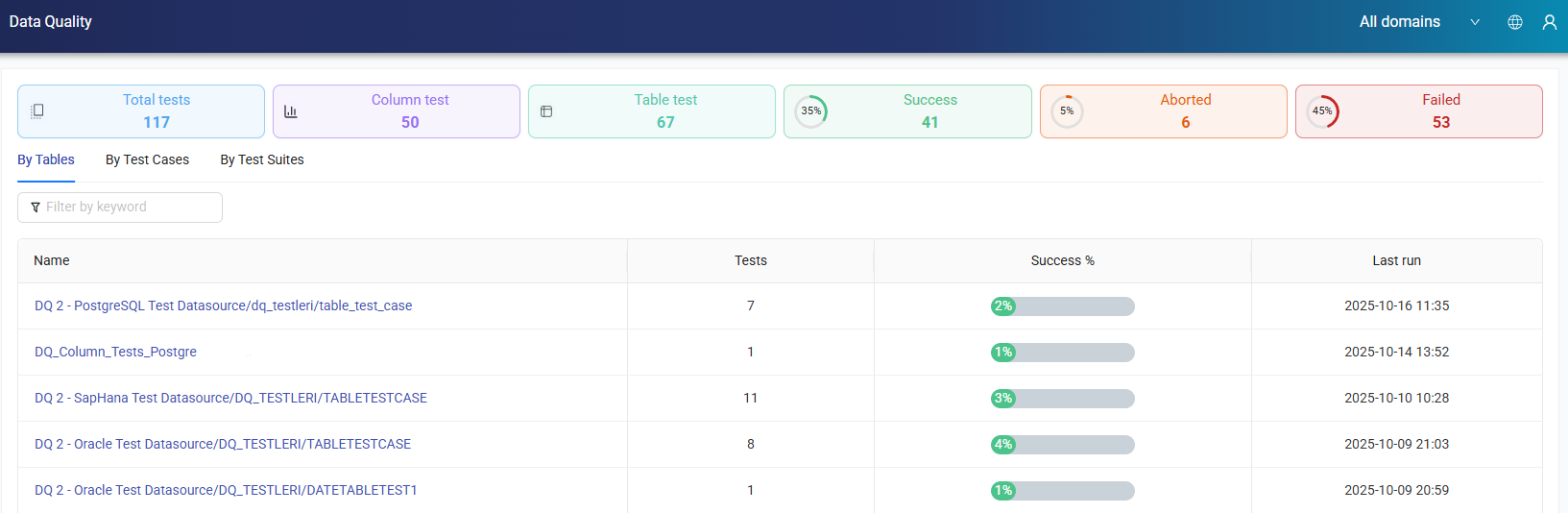 Data Quality displays the total number of tests performed, along with the counts of Success, Aborted, and Failed tests. You can access related tests and their details through the By Tables, By Test Cases, and By Test Suites tabs.