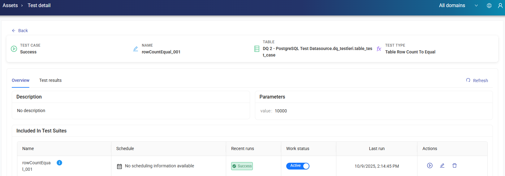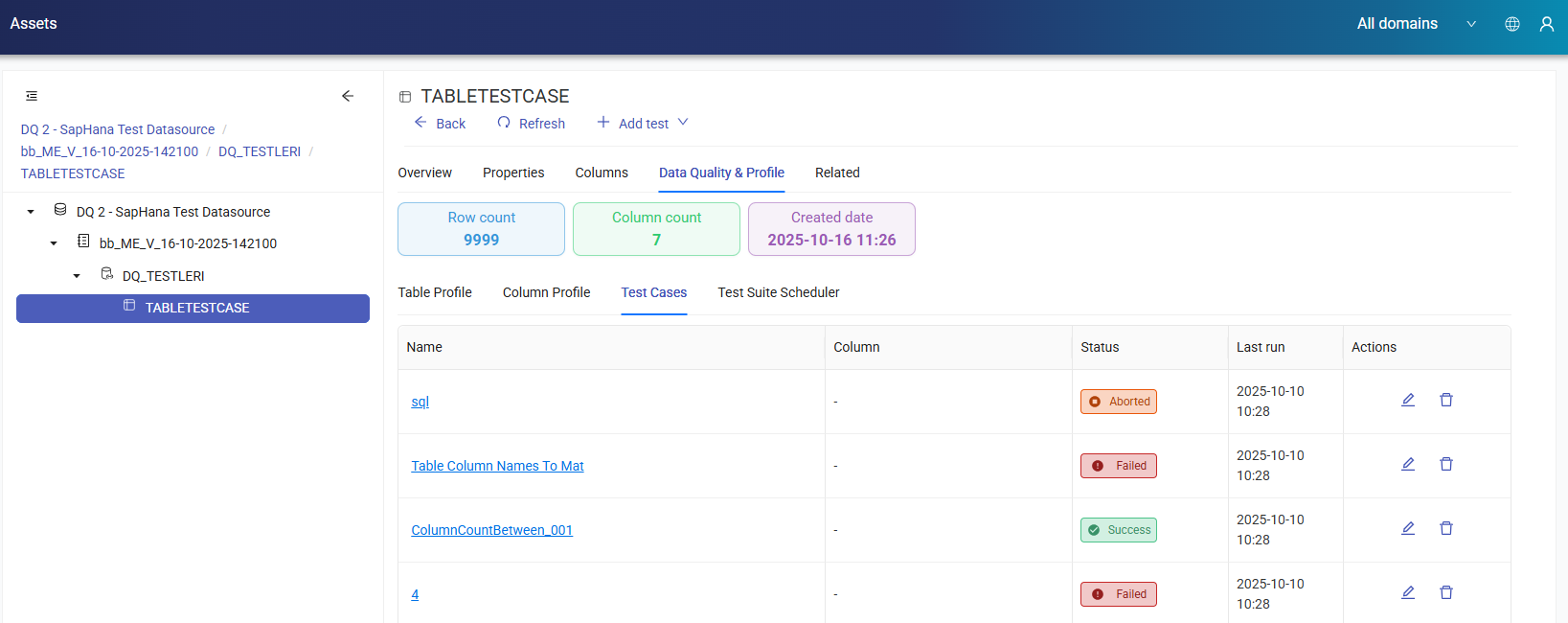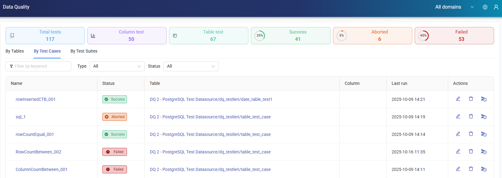 It displays test cases along with the related table, column, and last run date details. Editing, navigating to the run page, and deletion operations are performed from the Actions section.