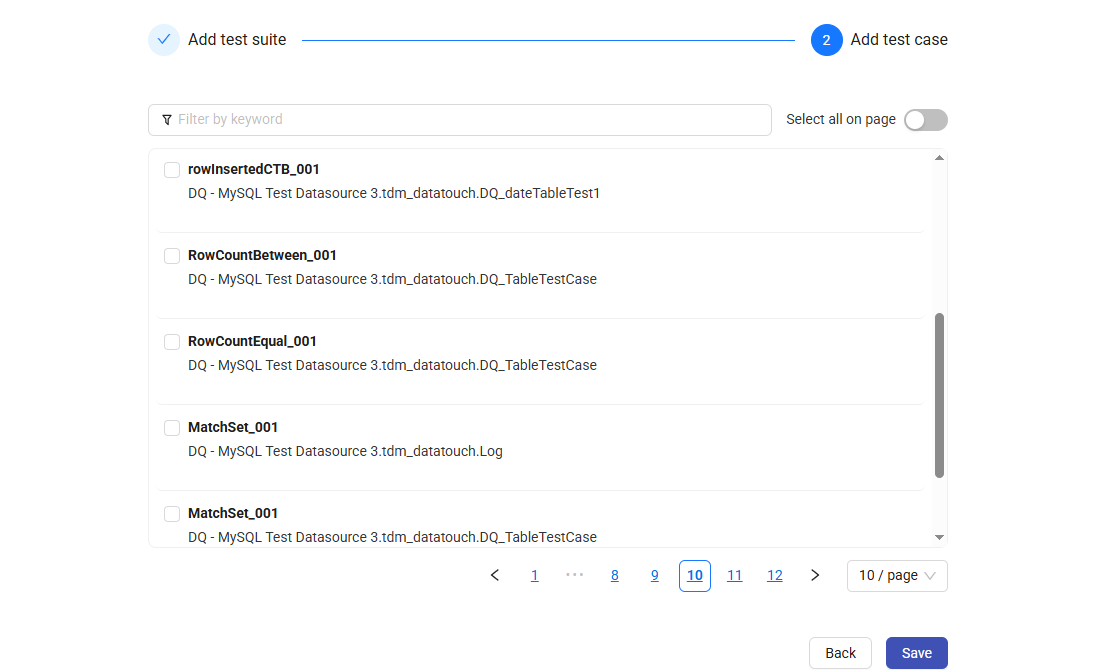 To create a new test suite, click the + New Test Suite button. Enter a name and description, then click Next.
